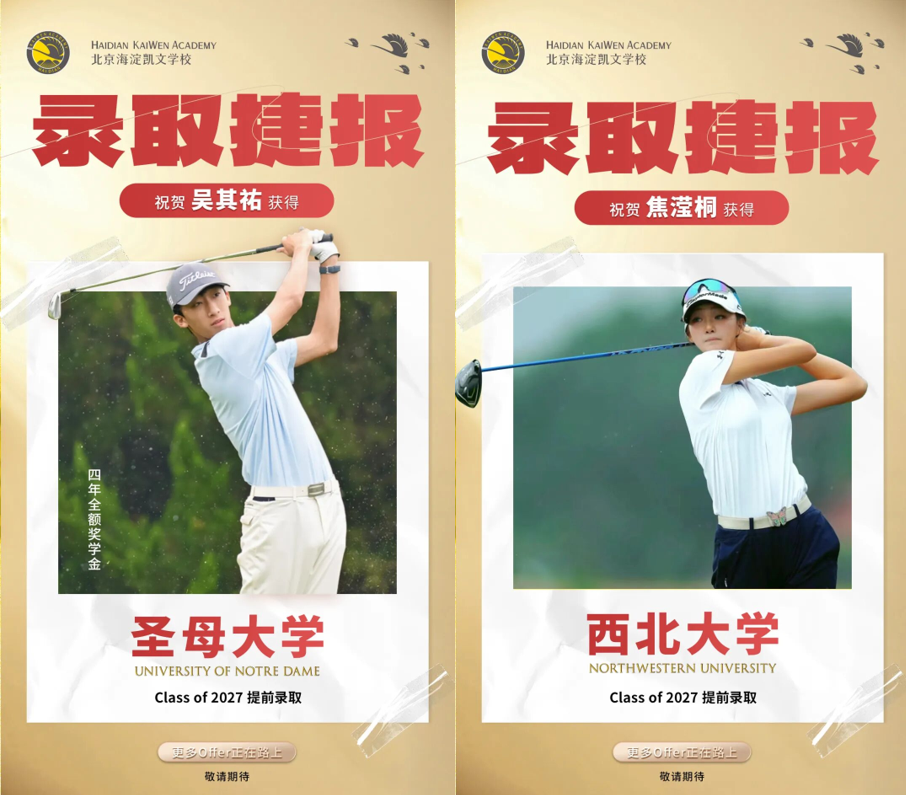 海淀凯文2027届学生吴其祐Tiger Wu、焦滢桐Ella Jiao凭借高尔夫特长分别获美国圣母大学(University of Notre Dame)和西北大学(Northwestern University)提前录取。此外,吴其祐还获得圣母大学提供的全额奖学金。