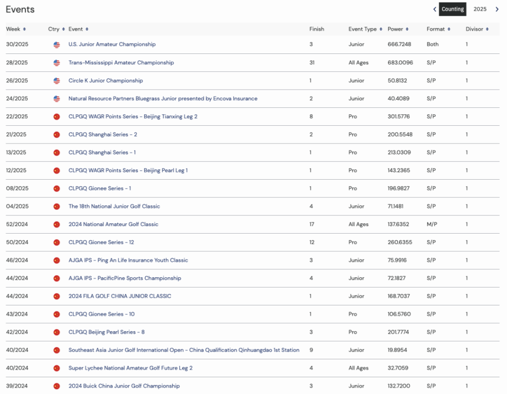 今年6月,Tiger又在美国青少年高尔夫协会(American Junior Golf Association, AJGA)赛事中取得冠军;紧接着,在7月由美国高尔夫球协会(United States Golf Association, USGA)举办的2025 U.S. Junior Amateur比赛中,Tiger在高手云集的比赛中取得了第三名的好成绩。