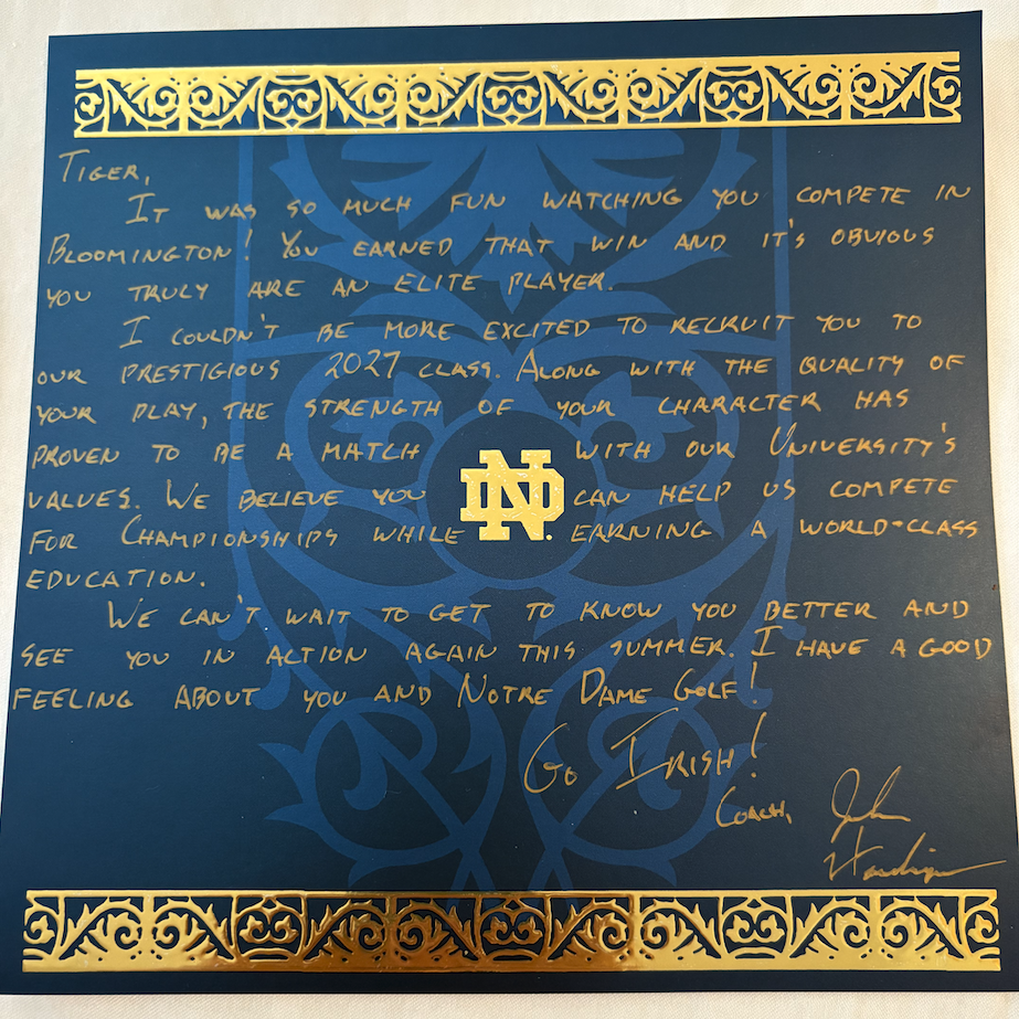 近两年,Tiger的高尔夫比赛成绩突飞猛进,在国内外多项赛事中崭露头角,并成功获得圣母大学(University of Notre Dame)的全额奖学金提前录取。