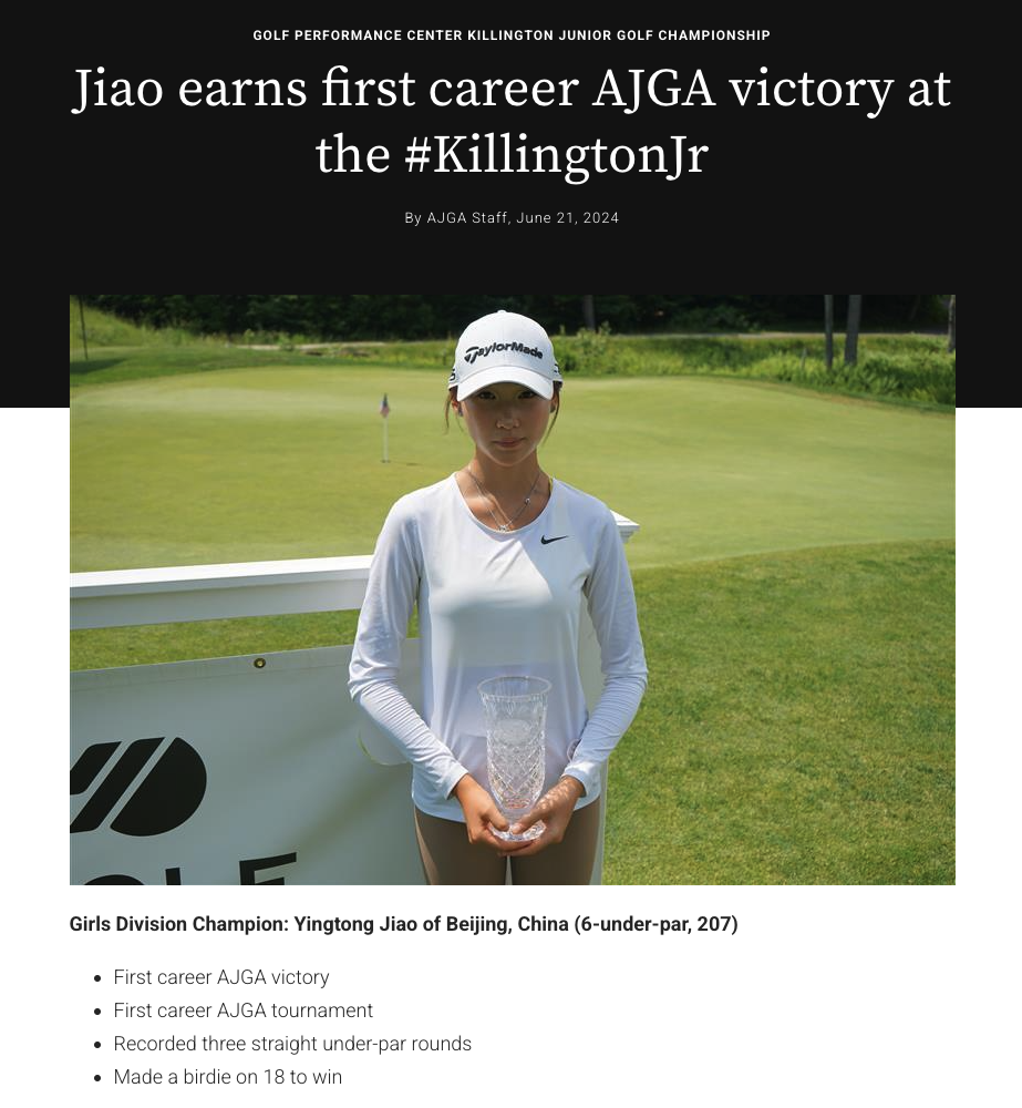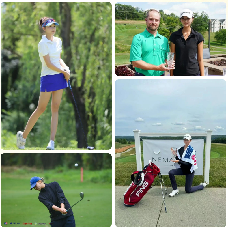 近两年的暑期,Ella都在美国参加各类高尔夫赛事,在比赛中不断磨练自己。2024年,Ella在美国青少年高尔夫协会(American Junior Golf Association, AJGA)赛事中首秀,并取得冠军;在紧接着的几场比赛中,Ella也都取得了不错的成绩。