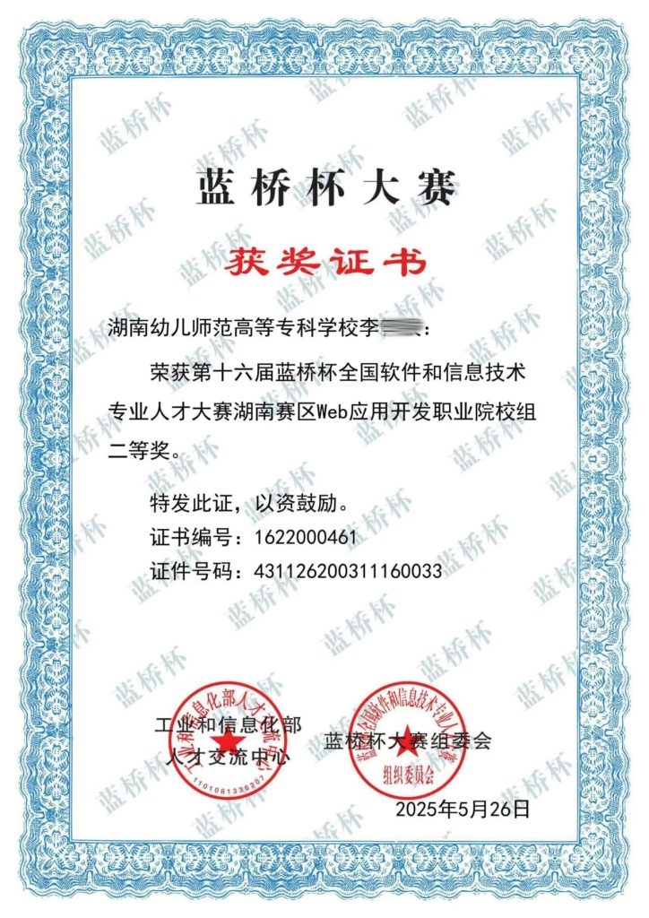 7月,2025 年第十六届 “蓝桥杯”全国软件和信息技术专业人才大赛全国总决赛成绩公布,湖南幼儿师范高等专科学校的学生在湖南赛区 Web 应用开发职业院校组脱颖而出,荣获二等奖。