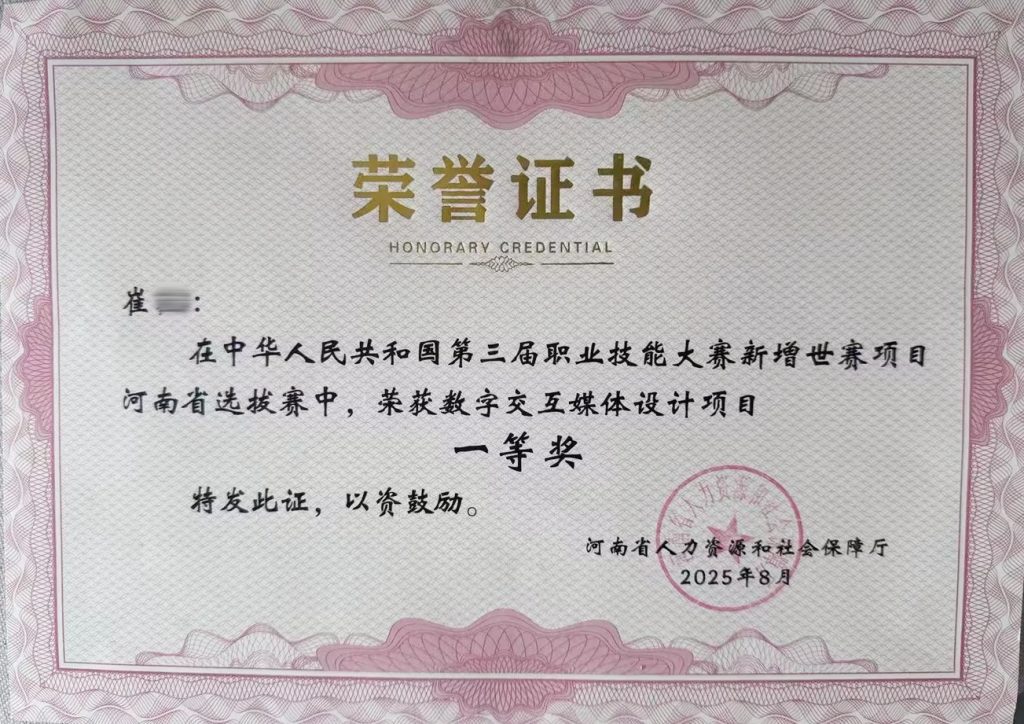 去年9月,河南省人力资源和社会保障厅公布了第三届职业技能大赛新增世赛项目河南省选拔赛获奖名单,郑州信息科技职业学院的学生荣获数字交互媒体设计项目的一等奖。
