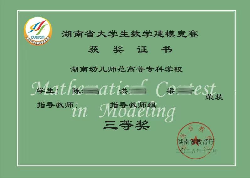 在第32届湖南省大学生数学建模竞赛暨全国大学生数学建模竞赛中,湖南幼儿师范高等专科学校的学生荣获数学建模赛项的团体三等奖。
