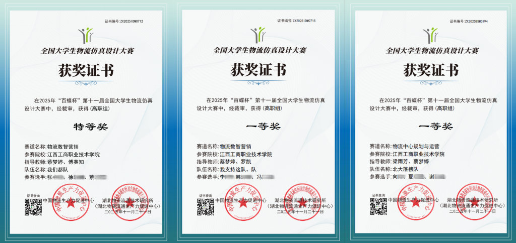 2025年“百蝶杯”第十一届全国大学生物流仿真设计大赛全国总决赛于11月公布结果,数智经济学院物流工程技术、智能物流技术专业的学生团队,斩获1项全国特等奖、2项一等奖。