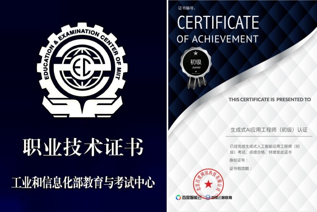 完成学习并通过考核的学生,可获得工业和信息化部教育与考试中心的职业技术等级证书,以及百度颁发的生成式人工智能应用工程师认证等级证书,提升学生在人工智能就业市场的核心竞争力。
