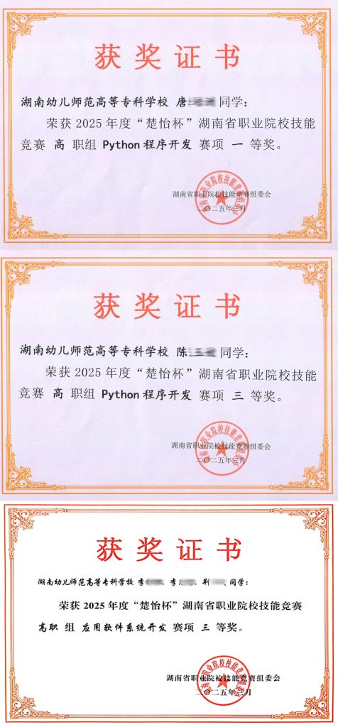 在2025年度“楚怡杯”湖南省职业院校技能竞赛高职组赛项比赛中,湖南幼儿师范高等专科学校的学生斩获多项佳绩。在高职组 Python 程序开发赛项中荣获1项一等奖、1项三等奖;在高职组应用软件系统开发赛项中获得团体三等奖。