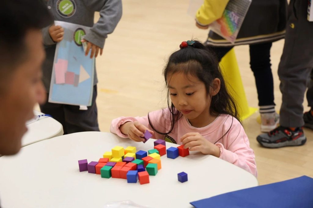 学前班(K)和一年级的同学们共同参与了传统七巧板、数字天平、彩虹项链、数字拨一拨、抓抓猜、拼拼贴贴、组成10等十个竞赛类活动。数学组的老师们希望利用该阶段孩子们的好奇心,引导孩子们了解和认识数学,消除对数学的恐惧心理,最终产生兴趣。通过学生们自助参与动手活动从而培养数感、空间感,进而把握数学规律,学会观察局部与整体的关系,是这次活动的主要目的。