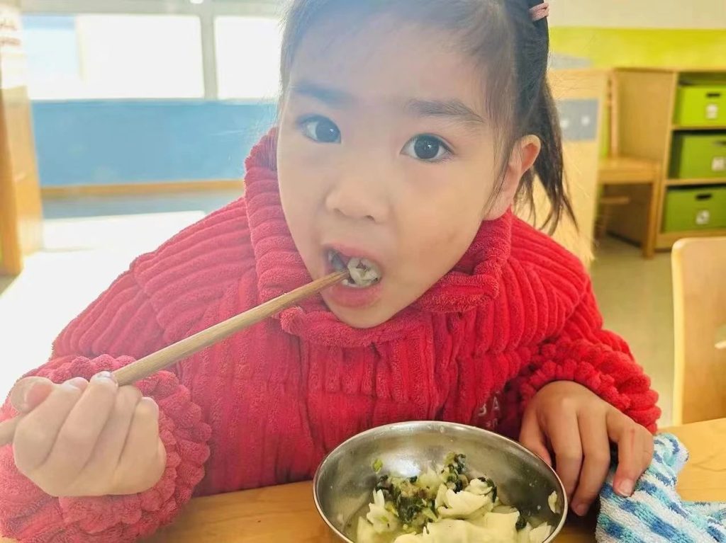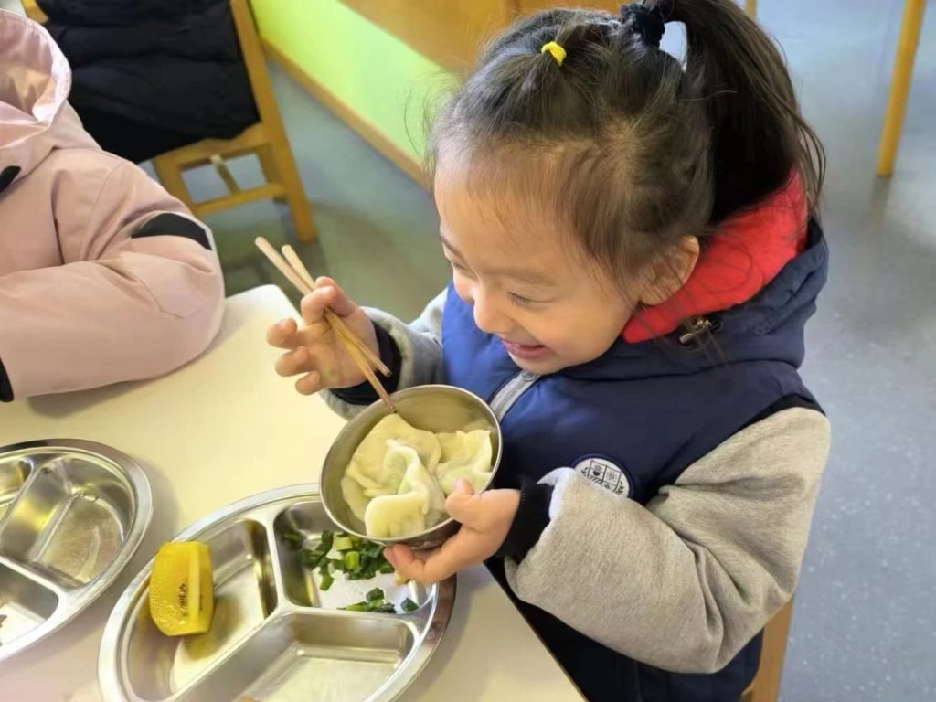 冬至,上海凯文教育园博华外国语幼儿园的小朋友们在老师们的指导下包饺子。“擀饺皮捏饺子,包好的饺子都很漂亮。下在锅里的饺子多像潜水艇,在沸腾的开水里一会儿浮出水面,一会儿又没入水中……”