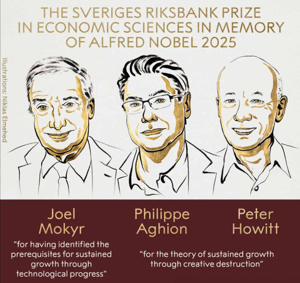 10月13日,瑞典皇家科学院宣布将2025年诺贝尔经济学奖授予Joel Mokyr、Philippe Aghion与Peter Howitt三位学者,以表彰他们基于 “创造性破坏” 理论,对创新驱动型经济增长机制做出的系统性阐释与突破性贡献。